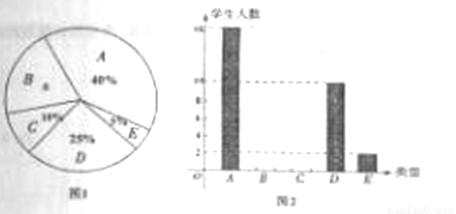 为了增强中学生的体质,某校食堂每天都为学生提供一定数量的水果,学校李老师为了了解学生喜欢吃哪种水果,进行了抽样调查,调查分为五种类型:A喜欢吃苹果的学生;B喜欢吃桔子的学生;C.喜欢吃梨的学生;D.喜欢吃香蕉的学生;E喜欢吃西瓜的学生,并将调查结果绘制成图1和图2 的统计图(不完整).请根据图中提供的数据解答下列问题: