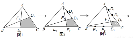 如图1,分别将AC,BC边2等分,D1,E1是其分点,连接AE1,BD1交于点F1,得到四边形CD1F1E1,其面积S1=