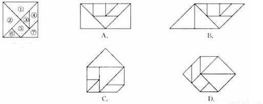 七巧板是我国祖先的一项卓越创造.下列四幅图中有三幅是小明用如图所示的七巧板拼成的,则不是小明拼成的那副图是( )![]()