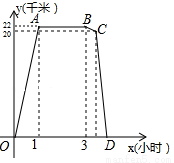 某周日上午8:00小宇从家出发,乘车1小时到达某活动中心参加实践活动.11:00时他在活动中心接到爸爸的电话,因急事要求他在12:00前回到家,他即刻按照来活动中心时的路线,以5千米/小时的平均速度快步返回.同时,爸爸从家沿同一路线开车接他,在距家20千米处接上了小宇,立即保持原来的车速原路返回.设小宇离家x(小时)后,到达离家y(千米)的地方,图中折线OABCD表示y与x之间的函数关系.