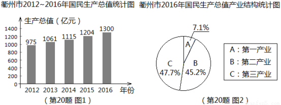 根据衢州市统计局发布的统计数据显示,衢州市近5年国民生产总值数据如图1所示,2016年国民生产总值中第一产业、第二产业、第三产业所占比例如图2所示。