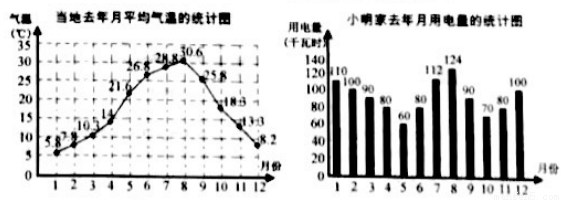 小明为了了解气温对用电量的影响,对去年自己家的每月用电量和当地气温进行了统计.去年当地每月的平均气温如图1,小明家去年月用电量如图2.