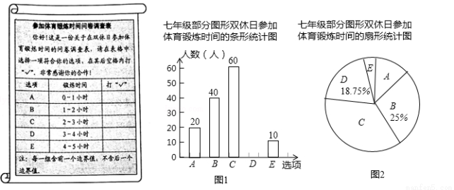 为了解本校七年级同学在双休日参加体育锻炼的时间,课题小组进行了问卷调查(问卷调查表如图所示),并用调查结果绘制了图1,图2两幅统计图(均不完整),请根据统计图解答以下问题: