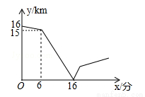 甲、乙两人在一条笔直的道路上相向而行,甲骑自行车从A地到B地,乙驾车从B地到A地,他们分别以不同的速度匀速行驶,已知甲先出发6分钟后,乙才出发,在整个过程中,甲、乙两人的距离y(千米)与甲出发的时间x(分)之间的关系如图所示,当乙到达终点A时,甲还需 分钟到达终点B.