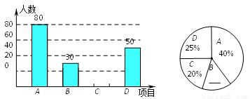 某中学开展“阳光体育一小时”活动,根据学校实际情况,决定开设A:踢毽子;B:篮球;C:跳绳;D:乒乓球四种运动项目.为了解学生最喜欢哪一种运动项目,随机抽取了一部分学生进行调查,并将调查结果绘制成如下两个统计图.请结合图中的信息解答下列问题: