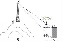 如图所示,某教学活动小组选定测量山顶铁塔AE的高,他们在30m高的楼CD的底部点D测得塔顶A的仰角为45°,在楼顶C测得塔顶A的仰角为36°52′.若小山高BE=62m,楼的底部D与山脚在同一水平面上,求铁塔的高AE.(参考数据:sin36°52′≈0.60,tan36°52′≈0.75)