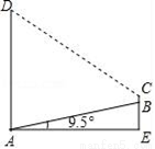 如图,AB为一斜坡,其坡角为19.5°,紧挨着斜坡AB底部A处有一高楼,一数学活动小组量得斜坡长AB=15m,在坡顶B处测得楼顶D处的仰角为45°,其中测量员小刚的身高BC=1.7米,求楼高AD.