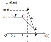 周末,小芳骑自行车从家出发到野外郊游,从家出发0.5小时到达甲地,游玩一段时间后按原速前往乙地,小芳离家1小时20分钟后,妈妈驾车沿相同路线前往乙地,行驶10分钟时,恰好经过甲地,如图是她们距乙地的路程y(km)与小芳离家时间x(h)的函数图象.