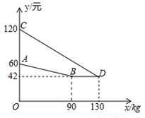 某企业生产并销售某种产品,假设销售量与产量相等.下图中的折线ABD、线段CD分别表示该产品每千克生产成本y1(单元:元)、销售价y2(单位:元)与产量x(单位:kg)之间的函