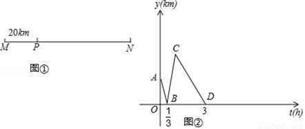 如图①,在一条笔直的公路上有M、P、N三个地点,M、P两地相距20km,甲开汽车,乙骑自行车分别从M、P两地同时出发,匀速前往N地,到达N地后停止运动.已知乙骑自行车的速度为20km/h,甲,乙两人之间的距离y(km)与乙行驶的时间t(h)之间的关系如图②所示.