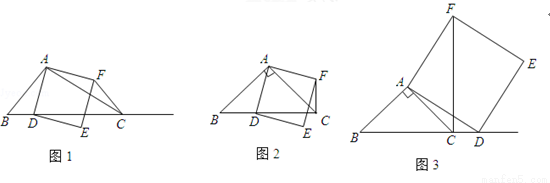 (10分)如图1,在△ABC中,∠ACB为锐角,点D为射线BC上一点,连接AD,以AD为一边且在AD的右侧作正方形ADEF.(提示:正方形的四条边都相等,四个角都是直角)