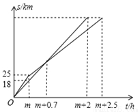 在一次自行车越野赛中,出发mh后,小明骑行了25km,小刚骑行了18km,此后两人分别以akm/h,bkm/h匀速骑行,他们骑行的时间t(单位:h)与骑行的路程s(单位:km)之间的函数关系如图所示,观察图象,下列说法: