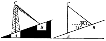 | 2009年初冬,我国西北部分省区发生了雪灾,造成通讯受阻。如图,现有某处山坡上一座发射塔被冰雪从C处压折,塔尖恰好落在坡面上的点B处,在B处测得点C的仰角为45。 |
