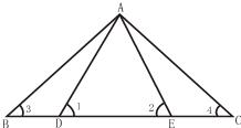21、如图D、E为△ABC边BC上两点,∠1=∠2,∠3=∠4,求证:BD=EC.