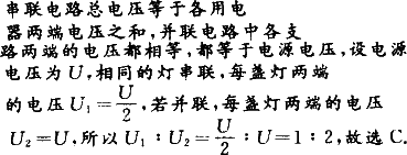 两个相同的灯泡串联起来接在某一电源上,每盏灯两端的电压为U1,若把它们并联起来接在同一电源上,设每盏灯两端的电压为U2,那么正确的是