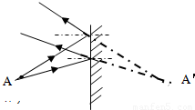 (3)从点光源A向镜面任意发出两条入射光线,根据光的反射定律中的反射角等于入射角,画出这两条入射光线的反射光线;将这两条反射光线反向延长,相交于点A′,点A′即为点光源A在平面镜中所成的像.如右图所示: