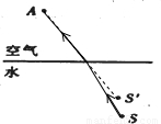 (2分)如图所示,S点是水中鱼所在的位置,S′点是人的眼睛在A处看到的鱼的像的位置。请完成此光路图。![]()