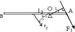 如图所示,杠杆BA在力F1、F2的作用下处于静止状态,l2是F2的力臂,在图中画出F1的力臂和力F2。![]()