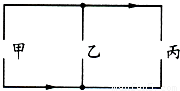 如图所示,箭头表示接好电路时的电流方向,甲、乙、丙三处分别接有电源、电灯、电动机,根据电流方向判断,电源应接在