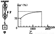 张强同学利用如图所示的滑轮组将货物运送到楼上,图中每个滑轮等重,不计绳子重和摩擦.如果所送货物重G从200N开始逐渐增加,直到绳子被拉断.每次均匀速拉动绳子,且提升高度都为10m.图乙记录了在整个过程中滑轮组的机械效率随货物的重力的增加而变化的图象.请根据有关信息完成以下问题: