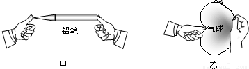 在探究“压力作用的效果与哪些因素有关”的活动中,同学们首先进行了热烈讨论和大胆猜想,接着设计了多种验证方案.然后,李亚同学按图甲所示进行操作,她觉得左拇指受压的感觉比右拇指要强得多;并且越用力,受压感觉越明显.徐真同学的实验如图乙,他观察到与手掌接触部分气球的形变较小,而用手指顶着的那部分气球形变明显;且手指用力越大,形变越明显.
