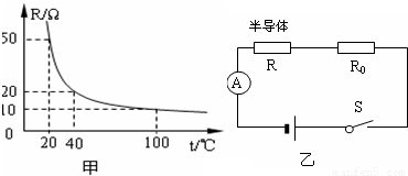 半导体的导电能力介于导体和绝缘体之间,其电阻受温度影响较大,如图甲所示是某种半导体材料的电阻随温度变化的关系图象.根据这种半导体材料电阻的特性,某物理兴趣小组的同学设计了如图乙所示的电路,用来测量某一环境的温度,已知定值电阻R