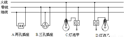 在如图所示的家庭电路中,插座、螺口灯泡(及其开关)的连线正确的是( )