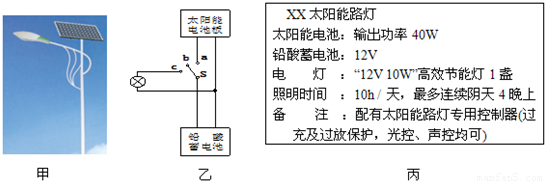 | XX太阳能路灯 太阳能电池:输出功率 40W 铅酸蓄电池:12V 电灯:“12V 10W“高效节能灯1盏 照明时间:10h/天,最多连续阴天4晚上 备注:配有太阳能路灯专用控制器(过 充分过放保护,光控、声控均可) |