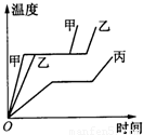 如图所示为甲、乙、丙三种物质在加热条件相同的情况下,温度随时间变化的图象,可以看出,这三种物质中,______ 可能是同种物质,______ 的质量一定比______ 的质量大.