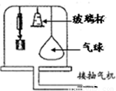 如图所示,密闭的玻璃罩内放有三个小实验装置:一个充气的气球,一个是弹簧测力计测重力,另一个是装满水的杯子,杯口用塑料薄片履盖并倒置悬挂在玻璃罩内.在用抽气机不断抽去罩内空气的过程中,观察到的现象是: