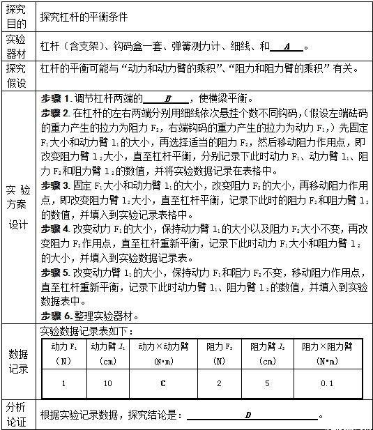 某同学在探究“杠杆的平衡条件”时,设计了一份探究性实验报告,报告的内容如下: