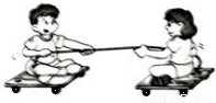 如图所示,小强和小丽坐在滑板车上,各自握住绳子的一端,同时向相反地方向用力拉动绳子.请你写出在此情境中涉及的两个物理知识.