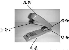 如图所示,是我们常见的订书机.订书机在构造上有许多地方应用到我们所学过的物理知识,请你找出两处.示例:弹簧的弹性势能转化为动能使订书机及时复位.