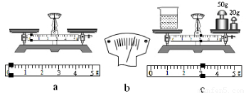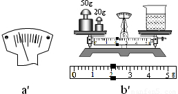 | (1)把天平放在水平台面上,游码归零,调节平衡螺母使天平横梁平衡,如图a. (2)测烧杯和盐水的总质量m1时,加减砝码并移动游码后,指针位置如图b. (3)向左调节平衡螺母使天平横梁平衡,如图c,m1等于右盘中砝码的总质量. | (1)把天平放在水平台面上,指针位置如图a′. (2)在天平左右两盘分别放置砝码和盛盐水的烧杯,加减砝码并移动游码至横梁平衡,如图b′. (3)杯和盐水的总质量等于盘中砝码的总质量加上游码所对的刻度值. | |