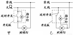现在控制楼道照明灯的开关大多采用延时开关,即开关闭合2min后会自动断开.同时延时开关板上还配有电阻很大、功率很小的红色指示灯,让上、下楼者能在黑暗中判定出开关的位置.而且这种指示灯,在开关闭合、照明灯发光时会自动熄灭,在开关断开、照明灯熄灭时又会自动发光而指示开关的位置.如图所示的两个电路中( )