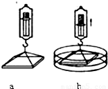 把一块表面很干净的玻璃板水平地挂在弹簧测力计下(图a),手持弹簧测力计上端,将玻璃板放到恰好与水槽内水面相接触(图b),并慢慢向上提起弹簧测力计.试说出这两次弹簧测力计示数有何不同,其原因是