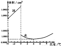 某研究人员为了探究冰和水的体积与温度的关系,在一定环境下将1g的冰加热,分别记录其温度和体积,得到了如图所示的图象.请你观察此图象回答下列问题: