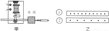 如图甲所示,纸带穿过打点计时器(每隔一定时间在纸带上打下一个点)与一木块左端相连,木块在弹簧测力计作用下沿水平桌面(纸面)向右运动时,就能在纸带上打出一系列的点.图乙中①和②是打点计时器先后打出的两条纸带,与其对应的测力计的示数分别为F