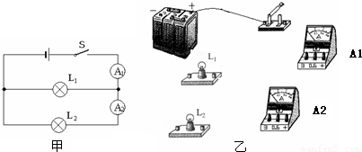 2的电流为0.4A.试根据图甲将图乙中的实物用铅笔线表示导线连接起来.