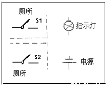 火车在车厢后面有两间厕所,只有当两间厕所的门都关上时(每扇门的插销相当于一个开关),车厢中的指示牌内的指示灯才会发光,指示牌就会显示“厕所有人”字样,提醒旅客两间厕所内部都有人,请你把图中的各元件符号连接成符合上述设计要求的电路图.