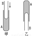 学完压强后,小明想,既然气体和液体都可以产生压强,那么如果在试管A中装满水,再把试管B套入其中一部分(如图甲),把两个试管倒置过来(如图乙所示),试管B会出现什么状态呢?