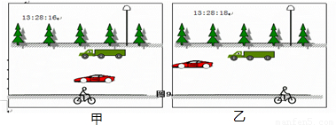小明在马路边上拍街景照片,先后连续拍了两张,如图甲、乙所示,如果以小轿车为参照物,大卡车向