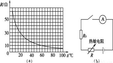 组成如图(b)所示电路,电源电压为12V,当电流表的示数为0.2A时,热敏电阻的温度为( )