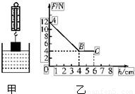 小明利用如图甲所示的实验,研究浮力大小与深度的关系.根据测得的实验数据,作出了弹簧测力计的示数F与物体下表面在水中所处深度h 的关系图象(如图乙).根据该图象可以得出的正确结论是(g取10N/kg)( )