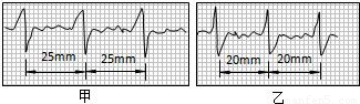 心电图仪(如图所示)通过一系列的传感手段,可将与人心跳对应的生物电流情况记录在匀速运动的坐标纸上.医生通过心电图,可以了解到被检者心跳的情况,例如,测量相邻两波峰的时间间隔,便可计算出1 min内心脏跳动的次数(即心率).同一台心电图仪正常工作时测得待检者甲、乙的心电图分别如图甲、乙所示.若医生测量时记下被检者甲的心率为60次/min.则: