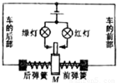 汽车中有如图所示的电路.电路中上端带金属细杆的金属滑块M与J两侧金属弹簧相连并接入电路中,M与弹簧套在光滑绝缘的水平细杆上,汽车静止时,M上的金属细杆与红、绿灯下端的触头都不接触,当汽车向前启动时( )