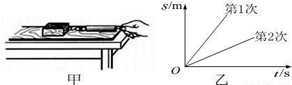 如图甲所示,小明用弹簧测力计拉木块,使它沿水平木板匀速滑动,图乙是他两次拉动同一木块得到的距离随时间变化的图象.下列说法正确的是( )