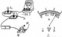 如图甲所示,用电流表测电流.若将线头M、N都接到电流表为“0.6”接线柱上,此时电流表的示数如图乙所示.则电流表测的是灯