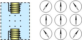 两个通电螺线管,它们的一端位于图中的虚线框内.为探究两个通电螺线管之间的磁场方向,把一个小磁针分别放在方框内9个点的位置上.记录小磁针在各位置上的指向如右图对应圆圈内的磁针所示.请画出方框内两通电螺线管之间的磁感线.小磁针涂黑的一端为N极.