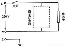 某电热水器的简化电路,如图所示.请你设计虚线框内的指示灯电路.供选择的器材有:“220V 10W”灯泡一只,“2.5V 0.75W”灯泡一只,“2V 10mA”发光二极管一只,各种阻值的电阻,导线若干.
